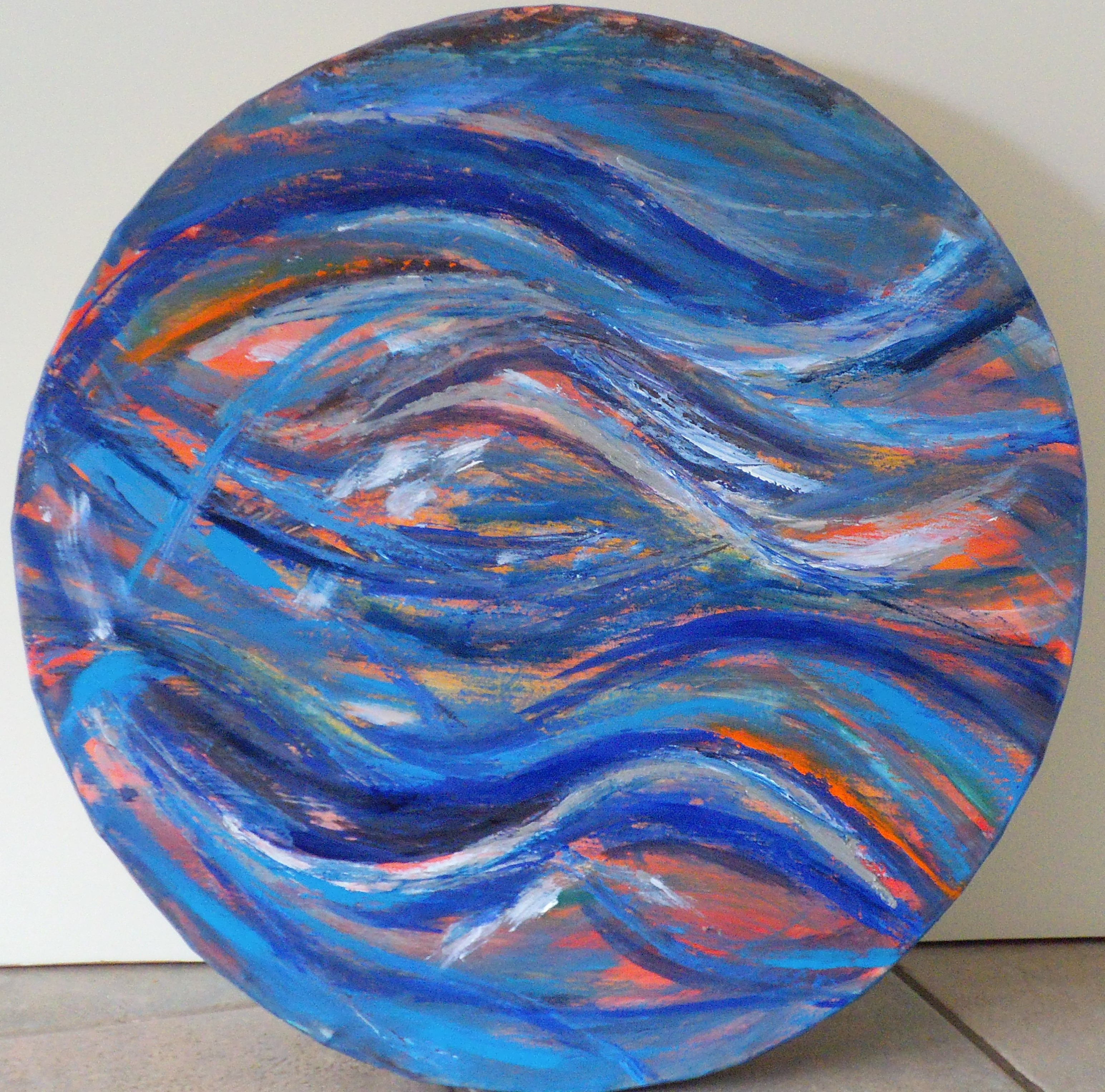 mand met zaden, bespannen met doek en beschilderd, doorsnede 65 cm, bij bewegen hoor je het geluid van de zee.